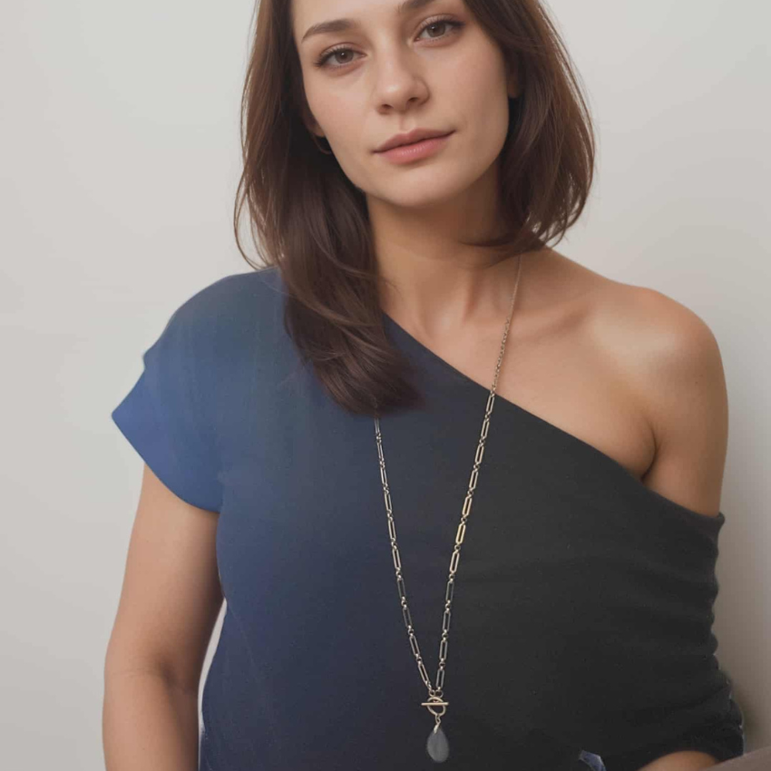 Beautiful longer line stainless steel paperclip chain necklace with a grey/blue natural quartz pendant.